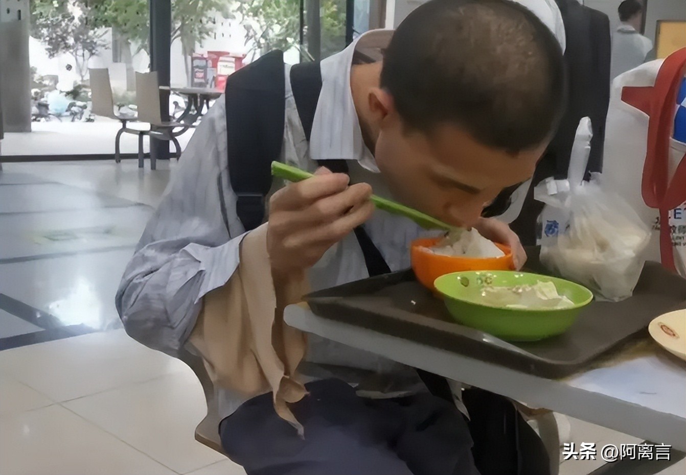 韦神珍惜每一粒大米,即使不小心扒拉到碗边沿,也会赶紧低头吃掉,他的餐具总是被清理得干干净净,没有一丝浪费。