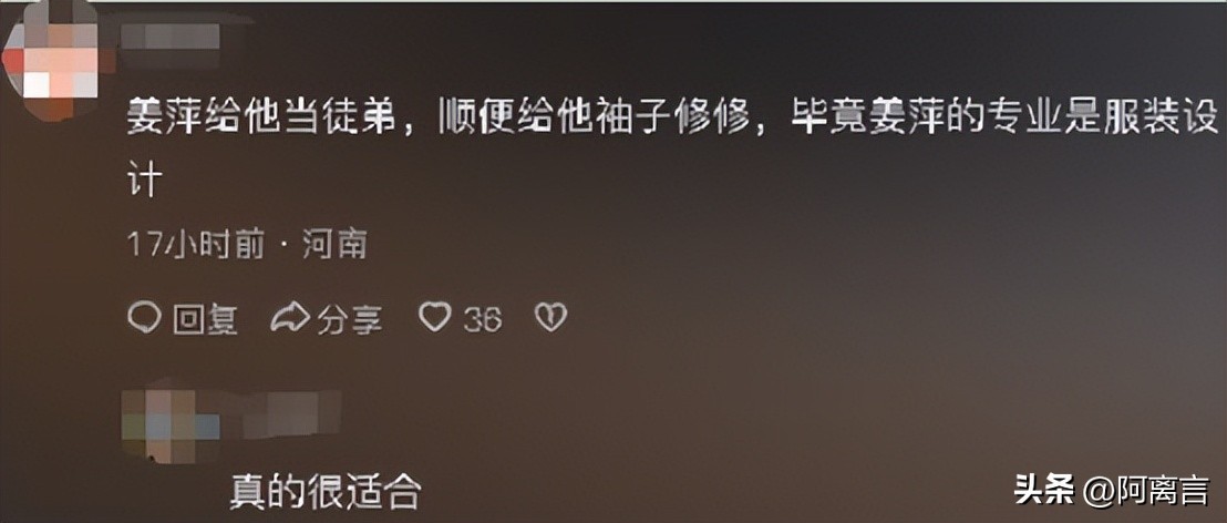 还有一些网友联想到姜萍和韦神的情况,提出了有意思的看法,他们认为,姜萍可以做韦神的徒弟,这样的话,姜萍也可以顺便给韦神缝补一下袖子,毕竟姜萍是专业的。