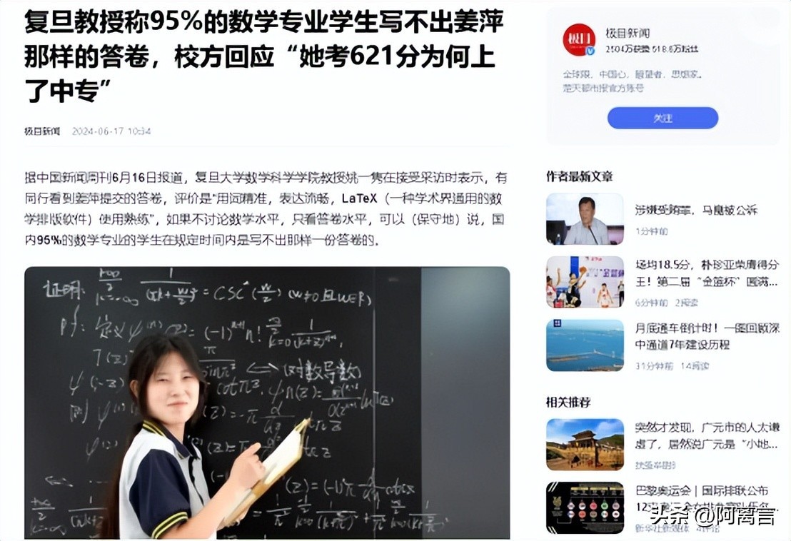 以上内容参考自极目新闻2024年6月17日关于“复旦教授称95%的数学专业学生写不出姜萍那样的答卷,校方回应“她考621分为何上了中专””的报道