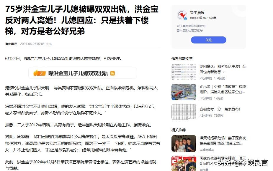 75岁洪金宝儿子儿媳被曝双双出轨,洪金宝反对两人离婚!儿媳回应:只是扶着下楼梯,对方是老公好兄弟.鲁中晨报.2025-06-25