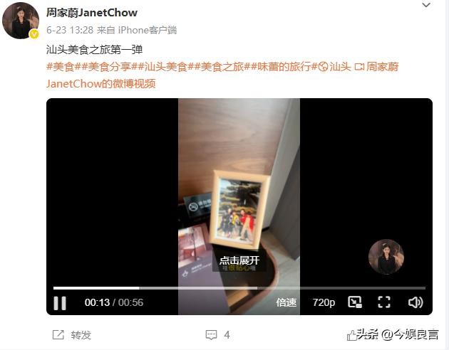 6月23日,周家蔚发布的汕头美食之旅照片中,床头柜上还摆放着全家福。