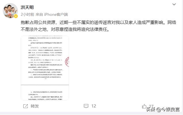 洪天明就公开发布了律师函强势辟谣。