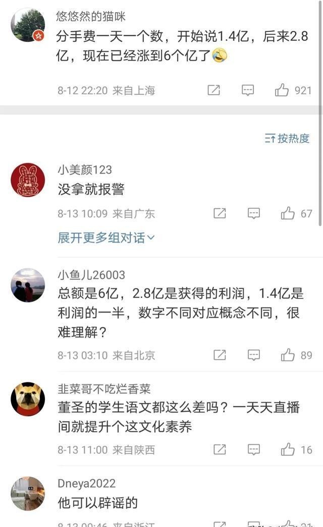 不过话说回来,6个亿的收入,真的准确吗?有意思的是,关于董宇辉的"分手费",网上的说法可是一天一个样。有上海网友就吐槽说:"分手费一天一个数,开始说1.4亿,后来2.8亿,现在涨到了6个亿了。"
