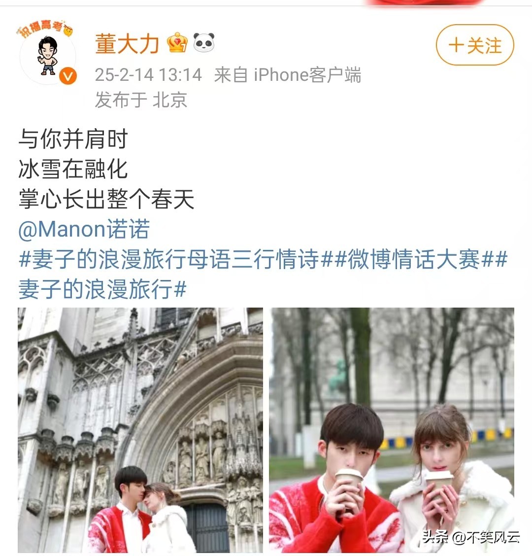 首先是董力在前几天情人节当天公布恋情,并加上节目《妻子的浪漫旅行》的话题,宣布自己要携手妻子一起加盟这档夫妻综艺。