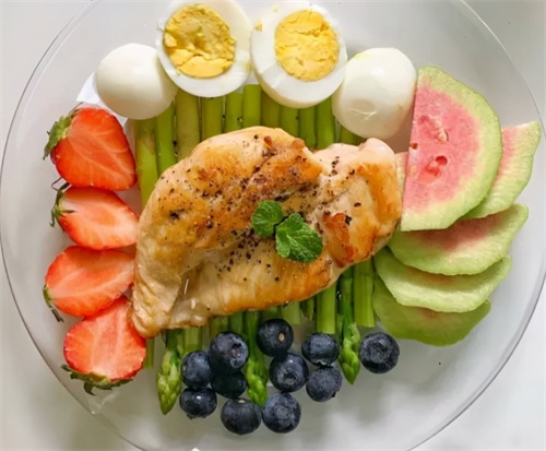 ③煎鸡胸肉➕白灼芦笋➕鸡蛋➕芭乐➕草莓➕蓝莓