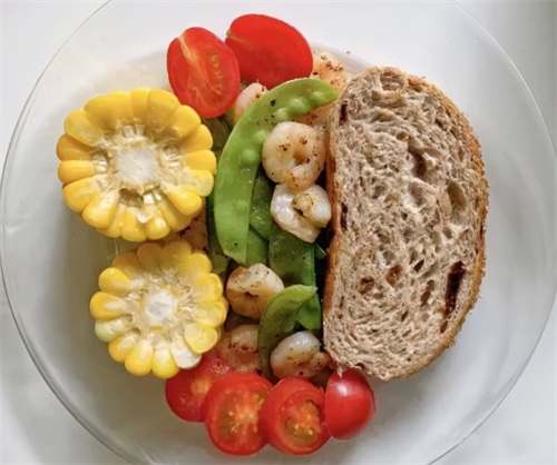 ②煮玉米➕全麦面包➕清炒虾仁荷兰豆➕圣女果