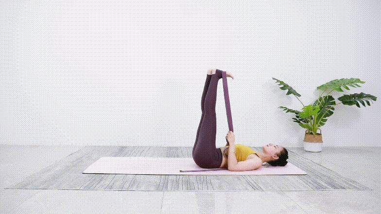 用一条长的伸展带,或是毛巾,套住左脚脚掌,让大腿垂直地面,同时下腰背部要完全贴地,避免腰椎代偿。