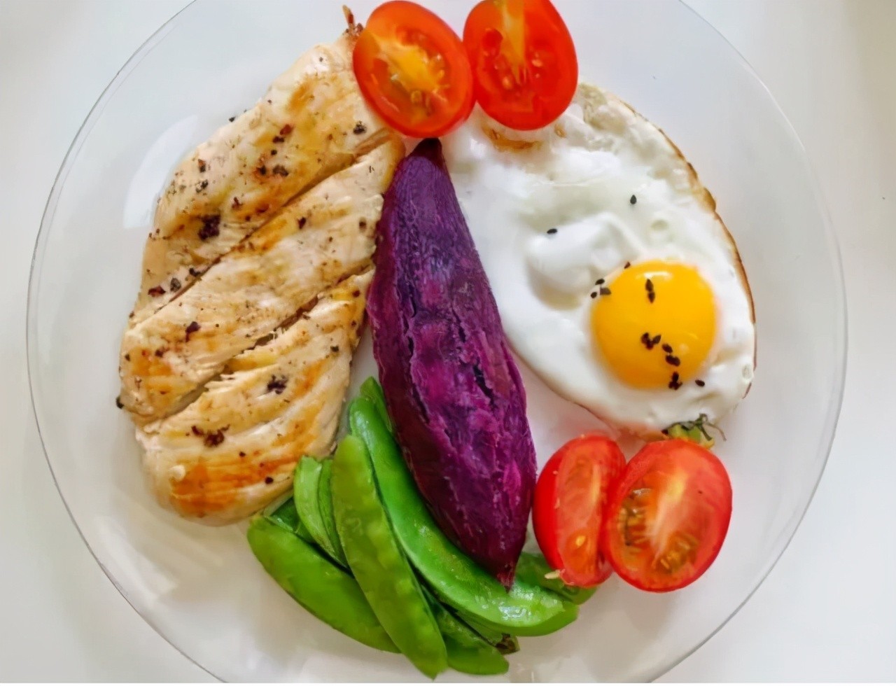 ①煎鸡胸肉➕紫薯➕煎荷兰豆➕鸡蛋➕圣女果