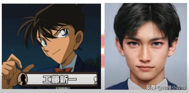 比起柯南略显幼稚的AI真人形象,高中生版工藤新“真人化”,一眼看上去不仅帅气,那股充满自信的感觉与动漫版也是如出一辙,哪怕整体五官比原版看起来要“成熟”一些,依旧让人感觉十分英俊,不愧是“平成时代的福尔摩斯”。