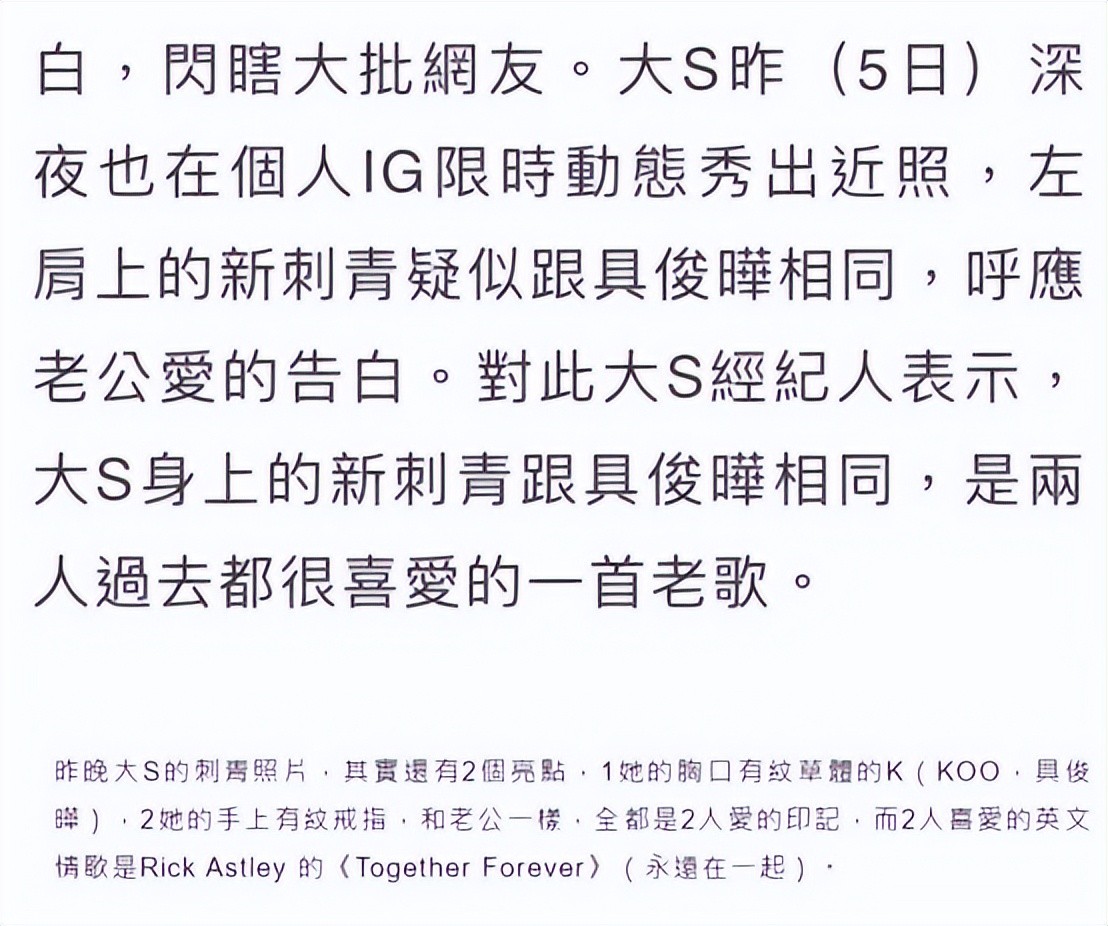 有人说这个纹身纹的名字还是老公具俊哗,而具俊哗曾经也有这样的一个纹身,而上边的是具俊华的曾经发布的一首歌曲,据说这个歌曲还是具俊哗送给大S的专属情歌,这也代表着两人的爱情,把你放在我的心口,记得我们要永远在一起,不得不说大S这一招在镜头面前故意露出纹身的操作太心机了。
