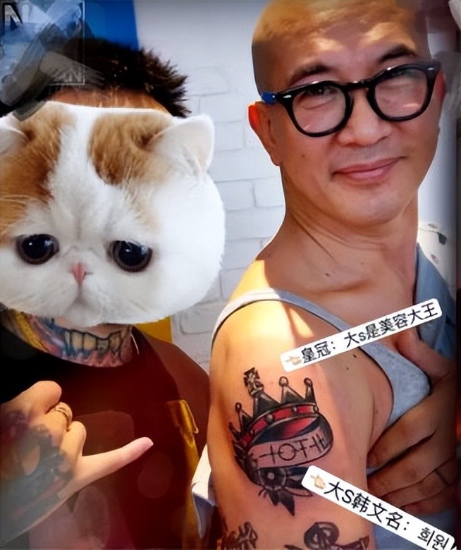 不得不说具俊哗很配合大S的一些炒作方式,当时还有不少的人大S身上的纹身进行了一通分析,尤其是这个大大的皇冠,代表的就是大S是公主和女王,其中具俊华还纹了大S的韩国名字,不得不说这位50多岁的大叔也够卖力的,为了和大S在一起也是够拼了。