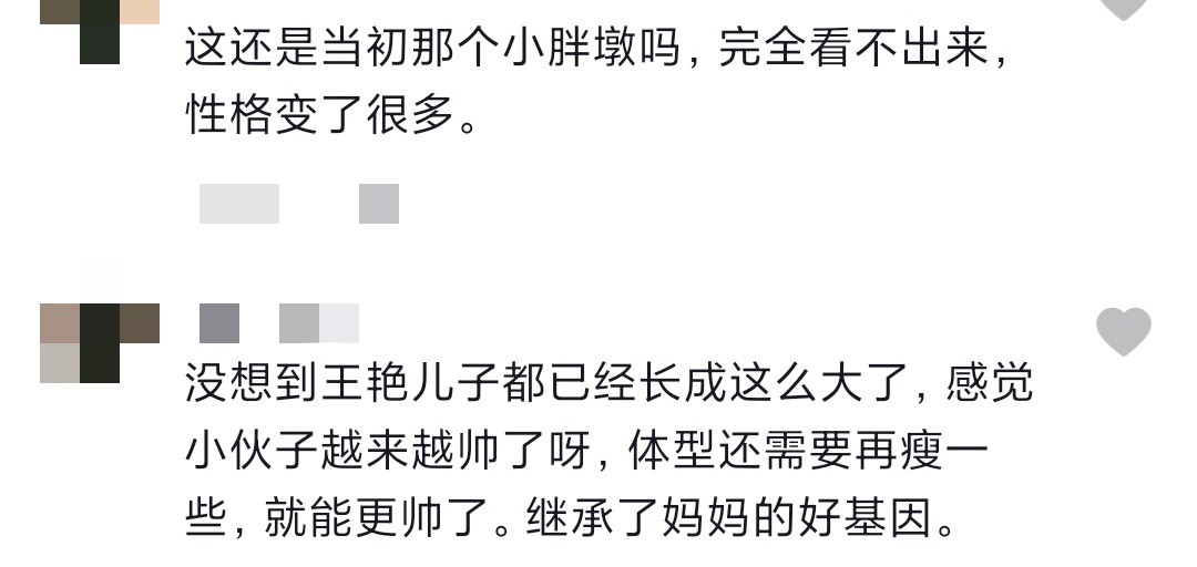 网友纷纷评论,“没想到王艳儿子都已经长成这么大了,感觉小伙子越来越帅了呀,体型还需要再瘦一些,就能更帅了。继承了妈妈的好基因。”“这还是当初那个小胖墩吗,完全看不出来,性格变了很多。”