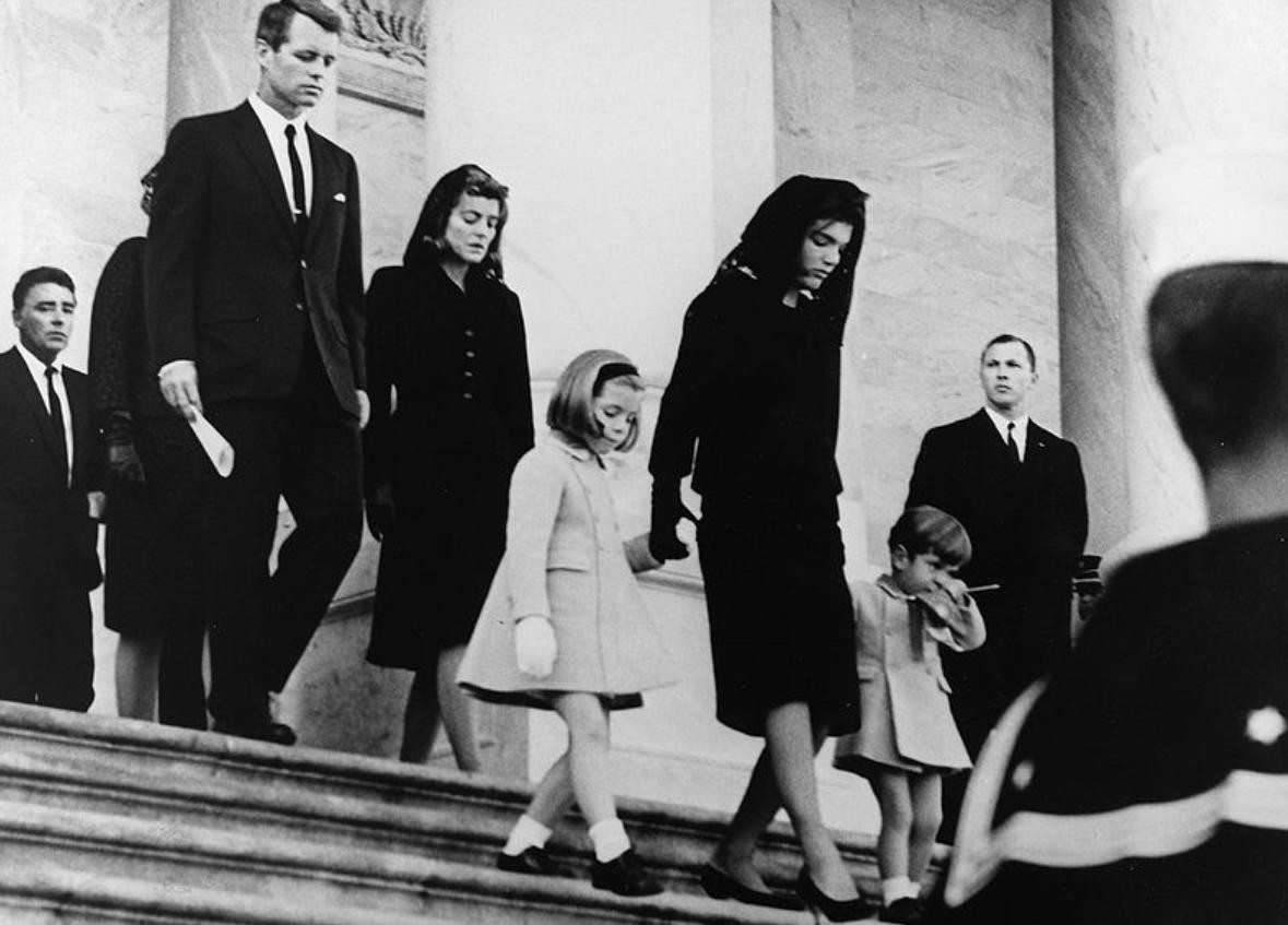 ▲公众瞻仰完肯尼迪的遗体之后,杰奎琳拉着儿女的手离开了白宫