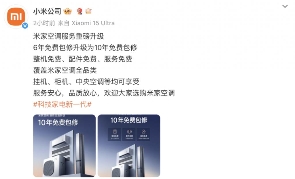 小米公司还表示,只要在 2025 年 1 月 1 日起完成首次安装的米家空调,不管是米家空调柜机、米家空调挂机,还是米家中央空调,不分型号覆盖米家空调全品类均会升级为 10 年免费包修。