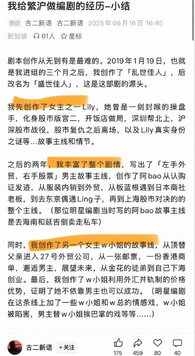 今年 3 月,一位名叫巫念顾的编剧也发文表示,她给电视剧《滤镜》写的全剧故事大纲、人物小传、26 集分场及 12 集对白剧本创作都被采用了,但自己没有获得任何署名权。