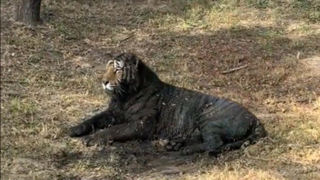 近日,黑龙江东北虎林园的东北虎 " 二埋汰 " 一身黑泥,远远看去仿佛穿了一身黑西装,逗笑整车游客。