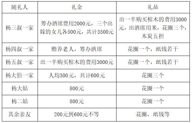 表 1 是杨三叔父亲去世后的丧葬礼单。