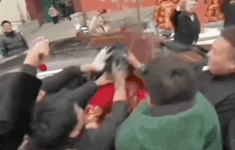 接新娘时,人群蜂拥而至,推搡、拉扯、打闹,不知情的人以为是群殴现场。