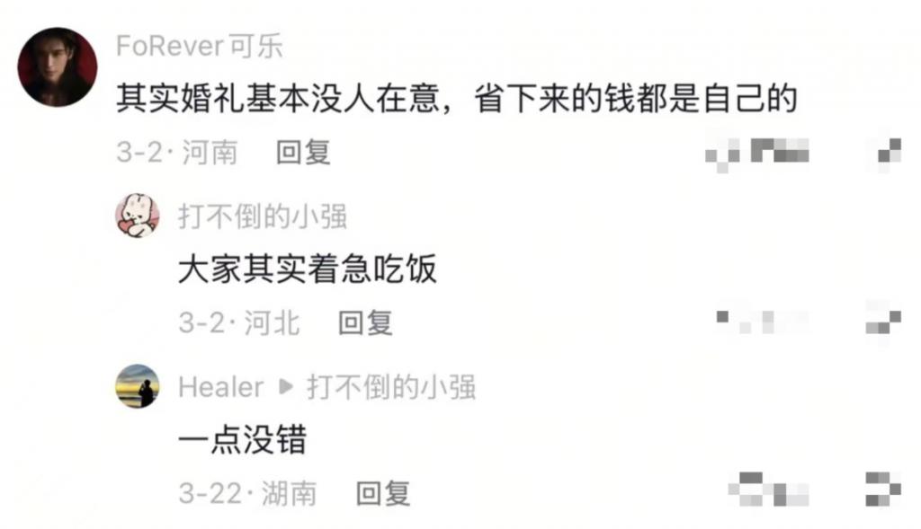 有网友的回复一针见血:"说实话,参加婚礼的人,很少在意你的仪式流程,也没人在乎你在台上哭没哭。大家真正关心的只有两件事——几点开席,以及今天的席好不好吃。"