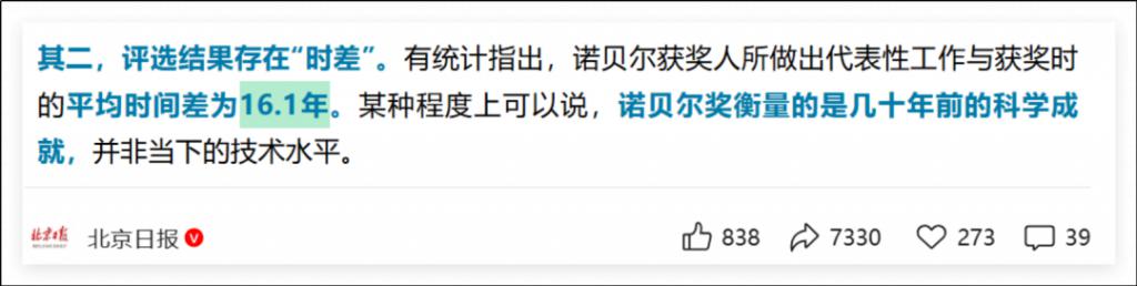 接着看,说评选结果存在 " 时差 ",理由是评价几十年的成果,跟当下科技发展水平关系不大。