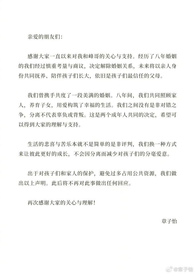 章子怡在其个人的社交媒体上发表了一份正式的声明,宣布了自己的婚姻关系。