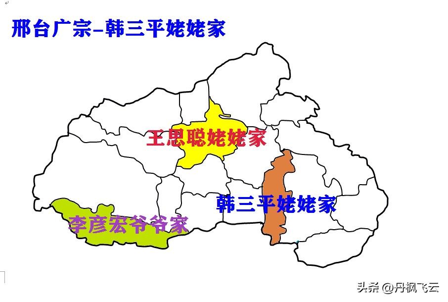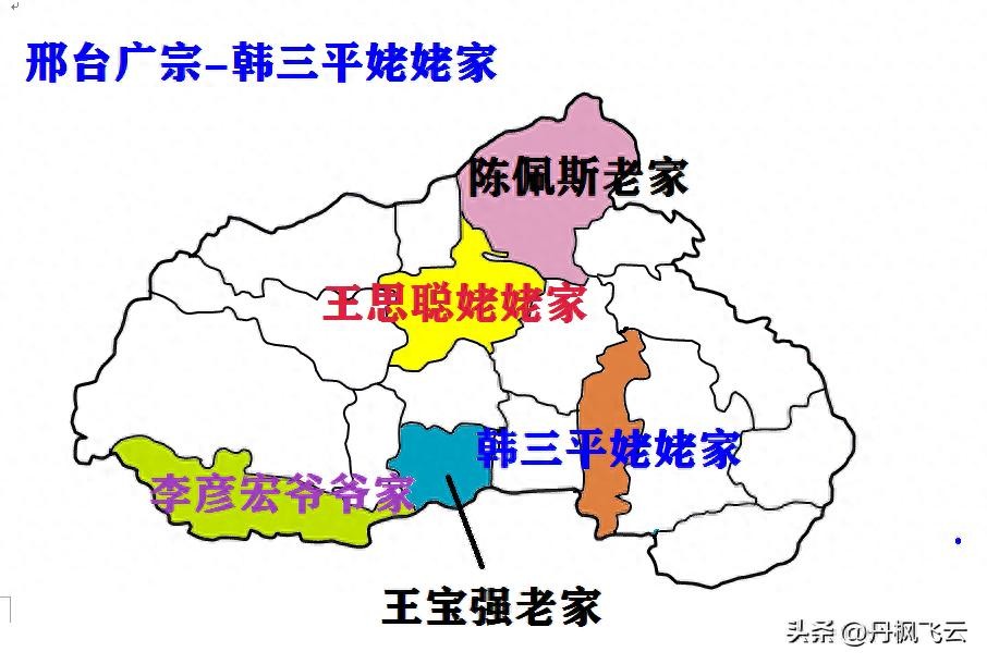 众所周知,王思聪的姥姥家是邢台隆尧,王思聪的姥姥家北边挨着陈佩斯的老家邢台宁晋,从王思聪姥姥家经过杜志国杜淳的老家邢台任泽区就到了王宝强老家南和区,再从王宝强的老家邢台南和区向东走二三十公里,就到了著名电影制片人韩三平的姥姥家(邢台广宗),王宝强老家的西边挨着百度李彦宏的爷爷和爹的老家沙河市,韩三平的姥姥家西边挨着孙国庆的老家邢台巨鹿,东北边是赵炎和尚长荣的老家邢台南宫,东南边过了威县则是付彪的老家邢台临西。