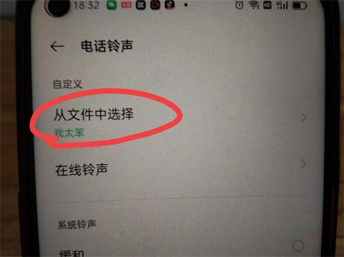 打开以后,如果我们的手机里面储存有一些歌曲,想要把它设置为来电铃声,如何操作的?我们点击从文件中选择,(如上图所示)