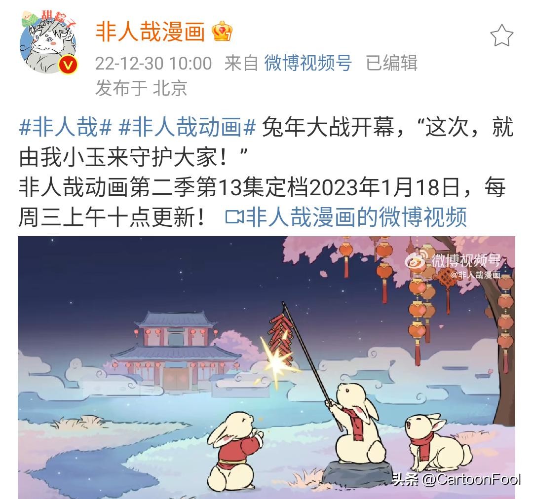 “兔年大战开幕,‘这次,就由我小玉来守护大家!’非人哉动画第二季第13集定档2023年1月18日,每周三上午十点更新!”