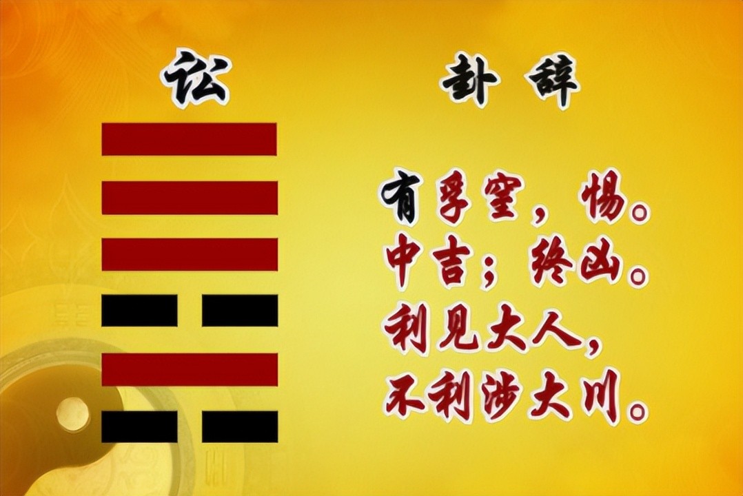 讼卦卦辞:有孚窒,惕,中吉;终凶,利见大人,不利涉大川。