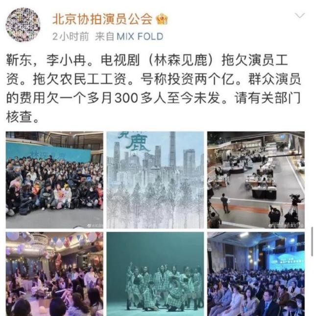 那么究竟是发生了什么,让怒气上头的靳东发了这么一则动态呢?原来,有昵称为“北京协拍演员公会”的网友爆料称靳东所在的《林深见鹿》剧组拖欠演员以及农民工工资,拖欠工资人数高达300余人。