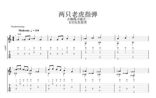 三、《两只老虎》吉他指弹六线谱加五线谱