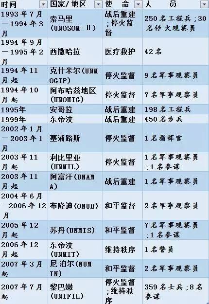 也正是在索马里,韩国第一次参与了联合国维和行动,从1993年7月到2010年前后,韩国共参与了14次联合国维和行动,派出了哪些人员,可以看看下面这张表: