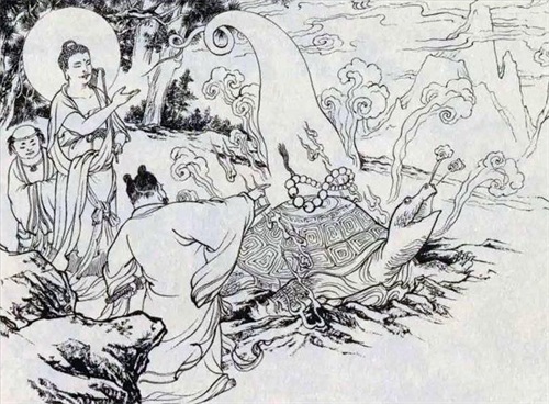 正好西方教主接引道人赶到,他让过惧留孙,拦住了龟灵圣母。龟灵圣母祭日月珠劈面打来,接引道人指上放一白毫光,光上生一朵青莲,托住了日月珠。龟灵圣母依旧用日月珠打来。接引道人将念珠祭起,龟灵圣母躲闪不及,被打得现出了原身,乃是一个大龟,被压得头足齐出。惧留孙欲挥剑斩之,被接引道人制止。