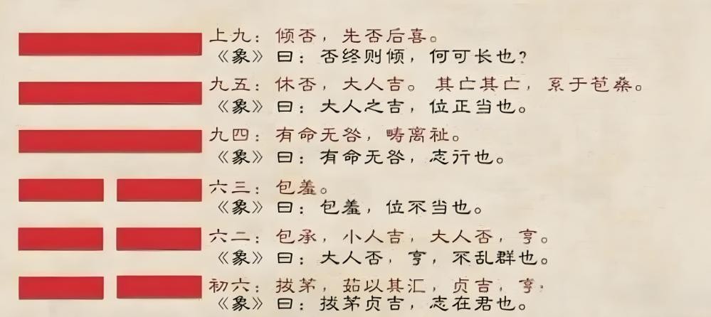 卦辞:“天地不交,否;君子以俭德辟难,不可荣以禄。”解释:当天地之气不交时,就形成了否卦。在这种情况下,君子应该以节俭和美德来避难,而不是追求荣华富贵和禄位。爻辞:初六:“拔茅茹,以其汇,贞吉,亨。”解释:拔取茅草时,根茎牵连着同类,这象征着在否卦之初,下位者仍然保持对君上的忠诚和正固的态度,这是吉祥且通达的。六二:“包承,小人吉,大人否,亨。”解释:包容承载,小人因此吉祥,但大人(君子)却闭塞不通。然而,六二爻仍然通达,说明在困境中仍有机会找到出路。六三:“包羞。”解释:包藏羞耻,这反映了六三爻的位置不恰当,处于困境中且难以自拔。九四:“有命无咎,畴离祉。”解释:有所受命,没有灾难,众人依附而得福。这表示九四爻既能接受君命,又能福利众人,心意得以实行。九五:“休否,大人吉。其亡其亡,系于苞桑。”解释:终止闭塞,大人(君子)吉祥。要时刻想到可能会灭亡的危险,才能像系在大树上一样稳固。这表示否卦到九五爻时开始停止,九五位置居正恰当。上九:“倾否,先否后喜。”解释:倾覆闭塞的现象,先闭塞然后喜悦。这表示闭塞到了极点就会倾覆,迎来转机。