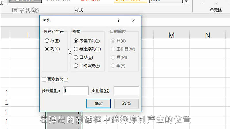 2、在弹出的下拉框中点击序列,在弹出的对话框中选择序列产生的位置,序列类型。