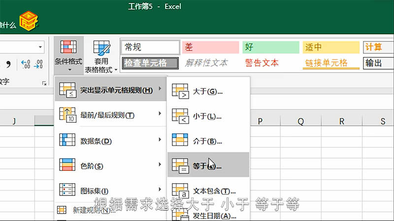 2、在下拉框中,点击突出显示单元格规则,根据需求完成选择。