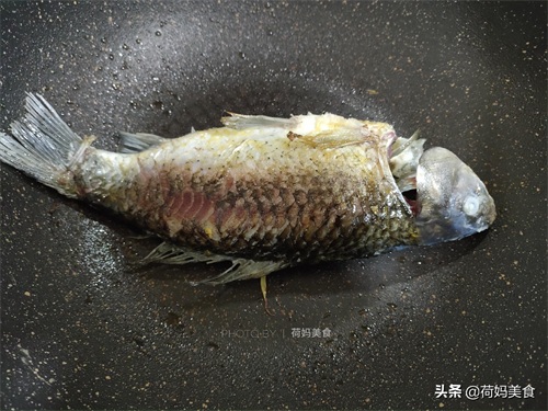 鲫鱼去掉腹部的黑膜,清洗干净,用纸巾擦干水分,放入锅里煎至微黄。这里我用的是不粘锅,如果是一般的铁锅,先将锅烧热,用姜擦拭一下锅底(目的是防粘,煎鱼不破皮),再倒入少许食用油,烧热后放鲫鱼再煎。