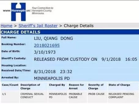 明尼苏达州监狱名单也证明,这个叫Liu Qiangdong的人,的确涉嫌性侵被美国明尼苏达警方于美国当地时间8月31日拘留,并于美国当地时间9月1日被警方释放。