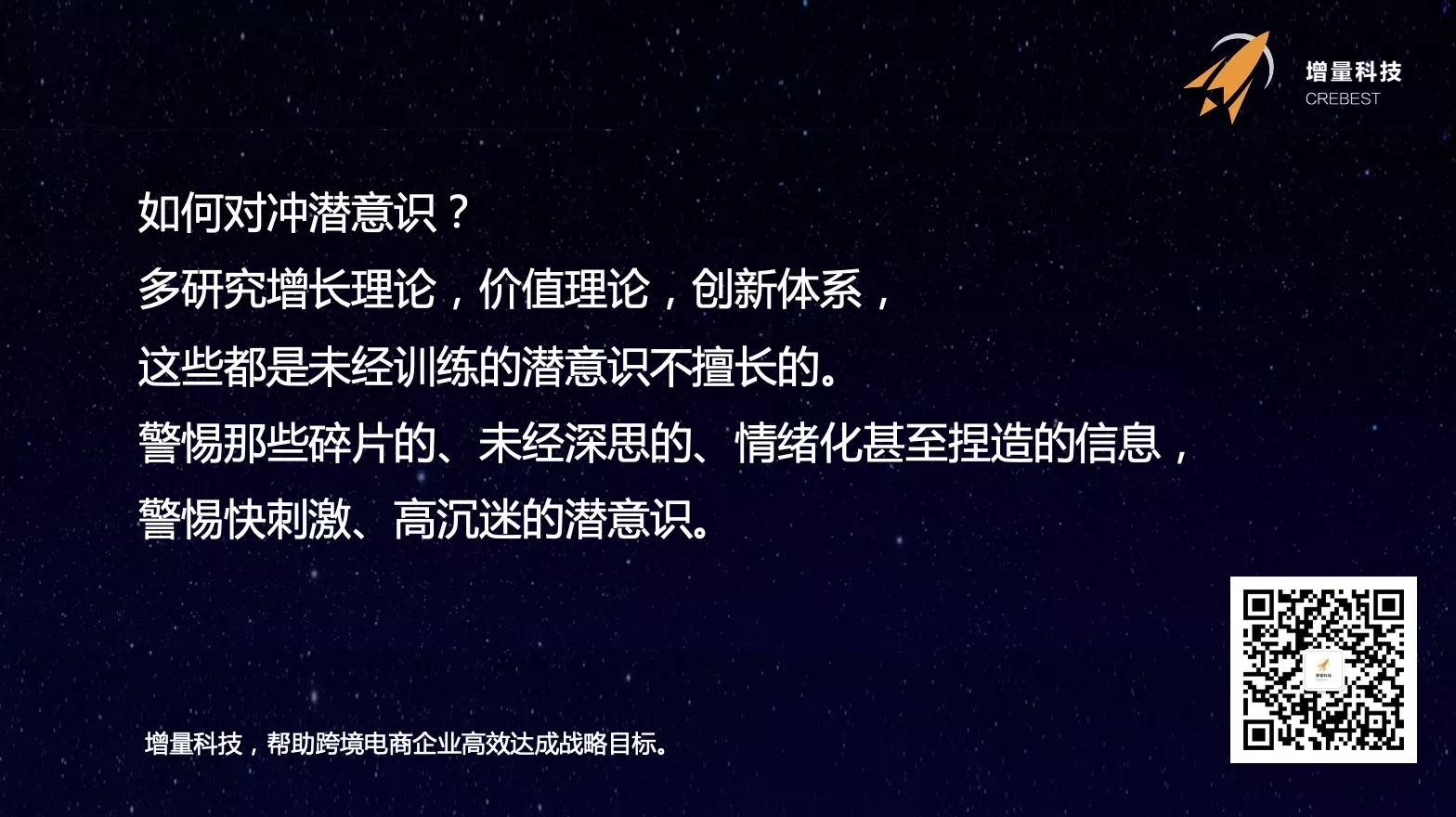 如何对冲潜意识,多研究增长理论,价值理论,创新体系,这些都是未经训练的潜意识不擅长的。警惕那些碎片的、未经深思的、情绪化甚至捏造的信息带给我们的潜意识,警惕快刺激、高沉迷的潜意识。