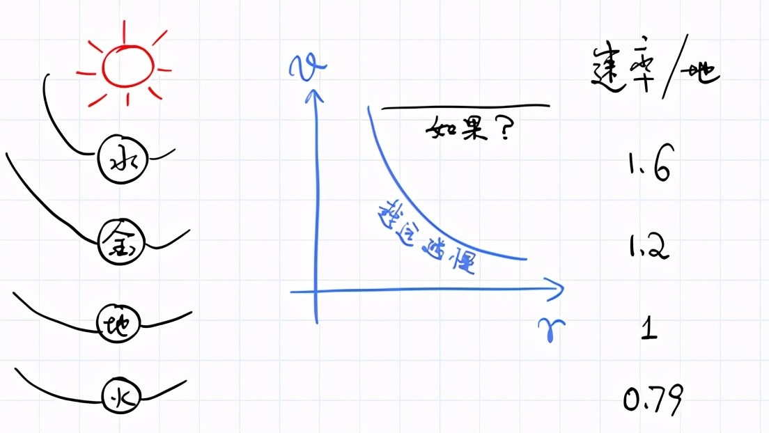 我们的太阳系由太阳以及围绕其转动的水星、金星、地球、火星等星体构成。水星、金星、地球、火星,我们很容易查到它们离太阳的距离以及它们运行的周期,这样就可以去计算它们运行的速率。可以看到,随着距离太阳越远,速度越来越小,这告诉我们离太阳越远的物体受到的太阳吸引力就越弱,所以它就不用跑那么快得去做圆周运动了。