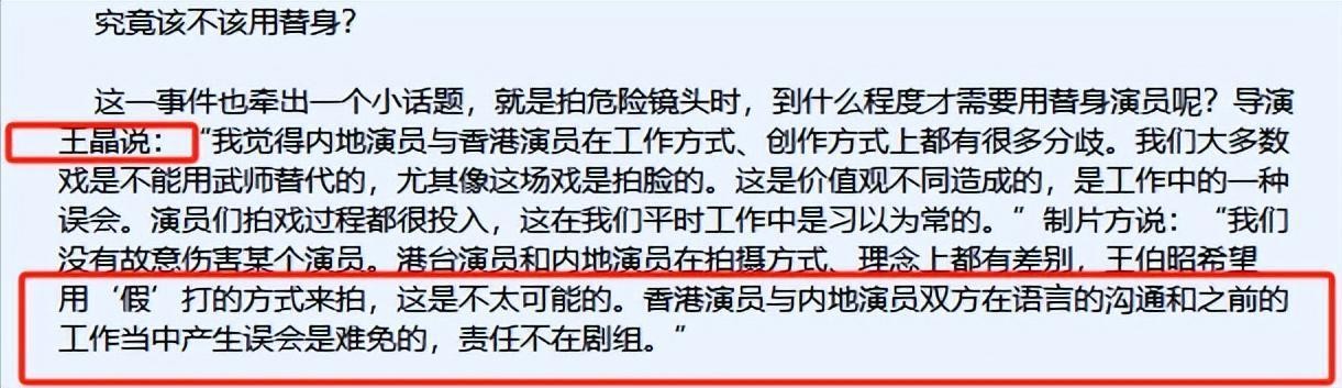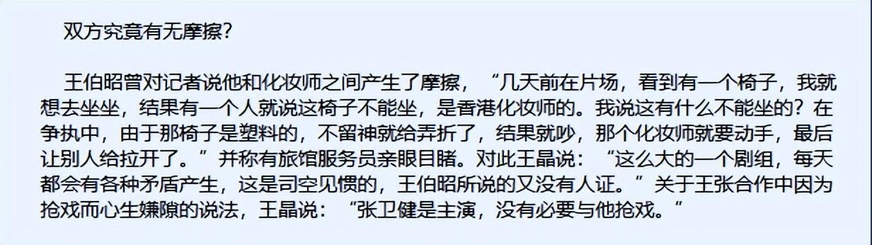 事发后,身为导演的王晶也是明显偏袒张卫健和谢霆锋两人,表示因为港台演员和内陆演员的表演方式不同,才会造成误会,并暗讽王伯昭有炒作的嫌疑。