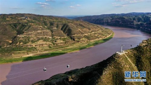 8月13日,游人乘坐乾坤湾景区的索道观赏黄河美景(无人机拍摄)。 新华社记者 陶明 摄