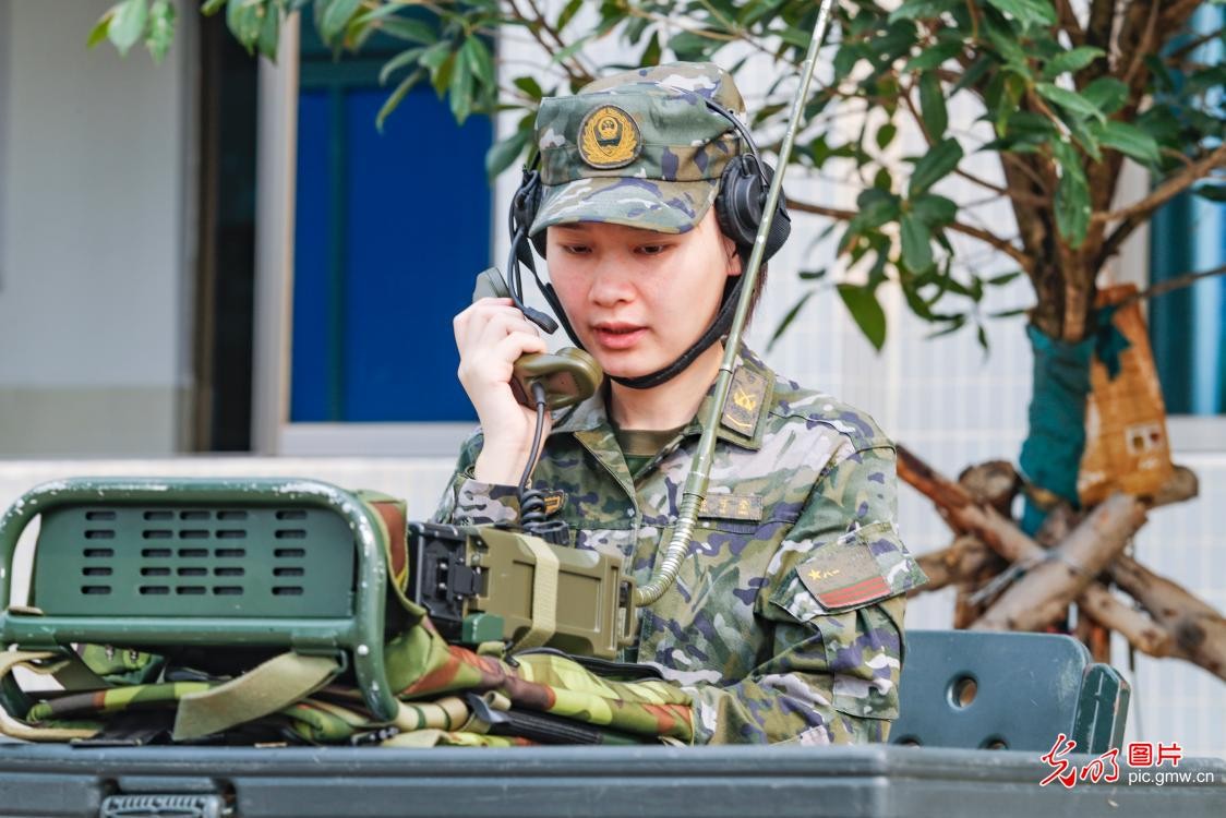 2023年3月24日,武警广西总队参谋部通信大队组织某中队女兵开展信息通信全要素演练、基础体能、擒敌基础动作等多种课目的强化训练,进一步提高女兵军事训练水平和业务能力,为下步遂行多样化任务奠定基础。图为武警女兵在进行无线电台操作训练。(余海洋摄/光明图片)