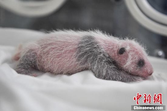 大熊猫“隆隆”诞下的幼崽在保育箱内接受身体检查。
