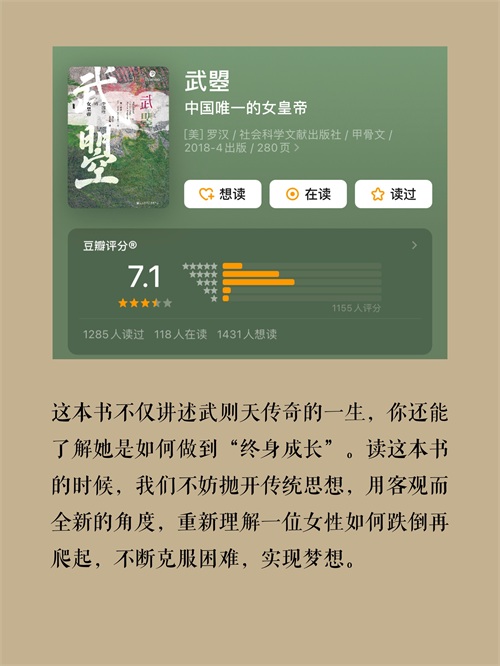 这本书不仅讲述武则天传奇的一生,你还能了解她是如何做到“终身成长”。读这本书的时候,我们不妨抛开传统思想,用客观而全新的角度,重新理解一位女性如何跌倒再爬起,不断克服困难,实现梦想。