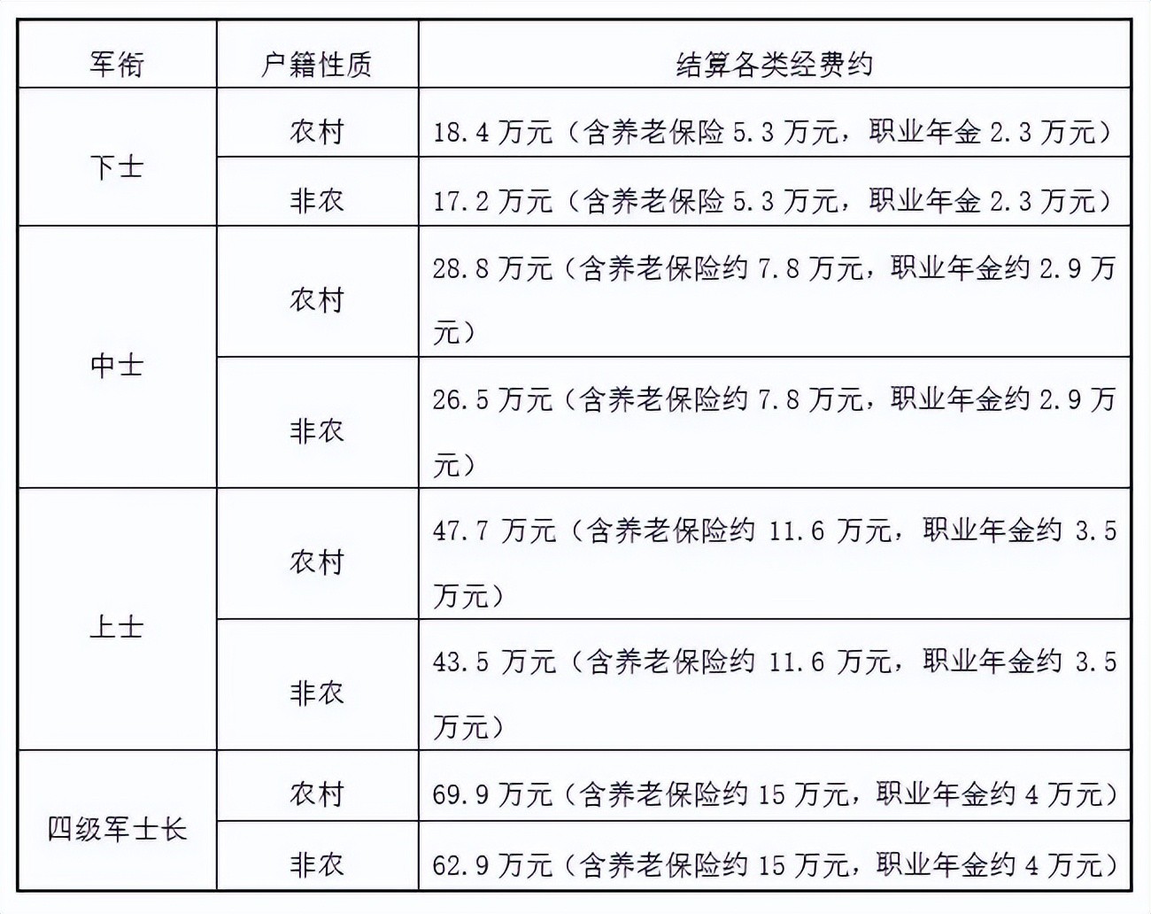 从表上也可以看到,农村籍的第五年下士补助有18万多;第8年中士28万多;当16年四级军士长能够有近70万。除去养老金对接地方外,自己还能拿到不少,现在部队期间的工资,士官每个月5000-7000,四级军士长差不多一万了,还有住房补贴和住房公积金,退役费都不少。