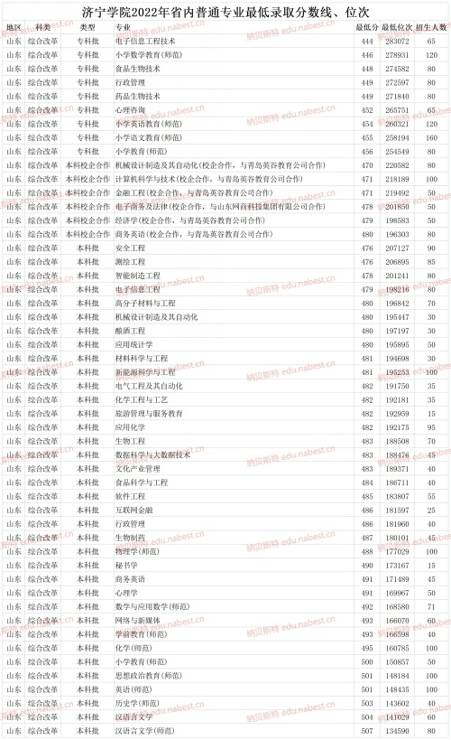 济宁学院2022年面向山东省内高考招生,同时设置有本科、专科专业,其中本科包含普通类本科专业、艺术类、体育类48个专业,专科包含普通专科专业、艺术类10个专业,在招生类型上还有公费师范生,目前学校招生官网已公布各类别、专业录取数据,纳贝斯特教育这里补充了普通专本科批次专业录取位次信息,供参考。