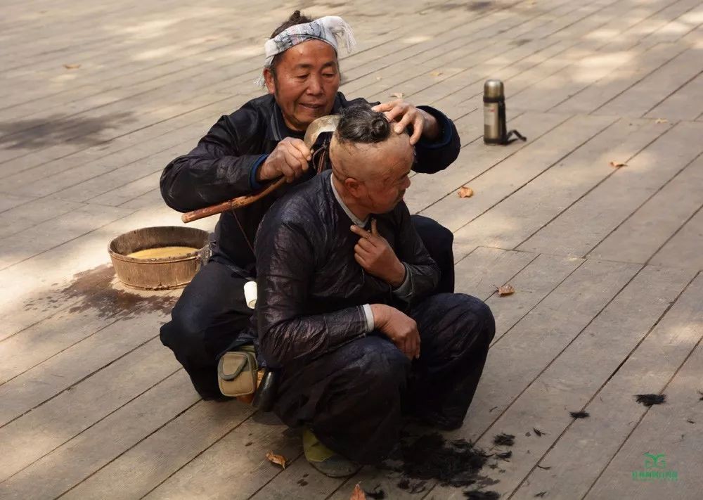 镰刀剃头挺有意思,它是岜沙人授予成人之礼的一种古老习俗。寨中长老用镰刀给男子剃头,剃掉周围头发,留下头顶一撮,并盘发为鬏髻,额头勒上挑花布巾。这个发髻,在岜沙苗语中称为“户棍”。
