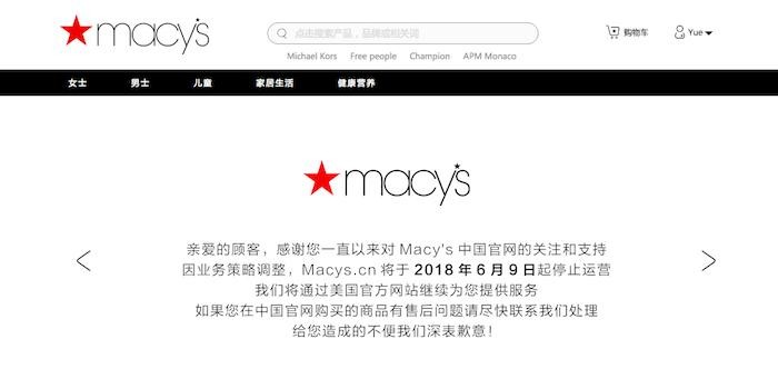 日前,美国梅西百货中国官网(Macys.cn)在首页发布了即将停止运营的公告,称“因业务策略调整,Macys.cn将于2018年6月9日起停止运营。我们将通过美国官方网站继续为您提供服务,如果您在中国官网购买的商品有售后问题请尽快联系我们处理”。