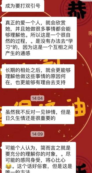 “真正的爱一个人,就会欣赏她,并且她所做的很多事情都会能够理解她。所以这是一个很自然的过程,是没有办法去“学习”的,因为这是一个互相之间产生的通感。”